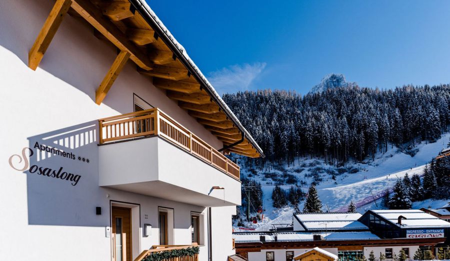 Am Ortseingang von Wolkenstein, im Herzen des bekannten Grödner Tales, liegt unser Apartmenthaus ruhig und freundlich am Fuße der bekannten Weltcupabfahrt Saslong.
