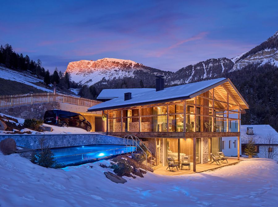 Wellness area with outdoor pool, private chef, concierge and full service for a dream holiday in Ortisei in Val Gardena.